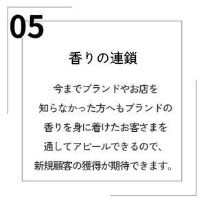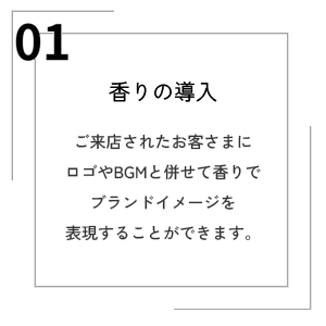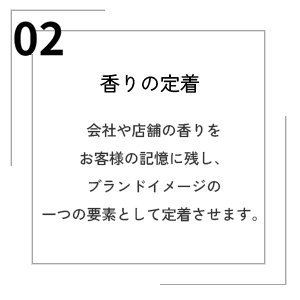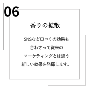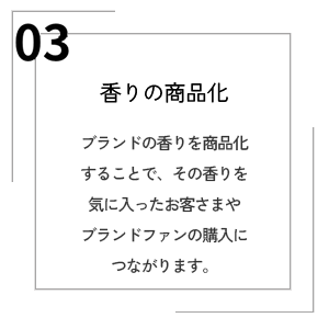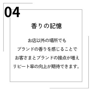 商品やサービスを提供する場所で、そのブランド・セントが流れていれば、@@BR@@顧客はその香りをブランドイメージとして印象深く記憶することとなります。@@BR@@そして再びその場所を訪れた際には、たちまち「ああ、あの香りだ」と@@BR@@思い出す事になるでしょう。@@BR@@あるいは、どこか別の場所でそれに近い香りに接した時にも、直ちに記憶が蘇ってきて、@@BR@@その香りと結びついた企業やショップを思い出す事になるのです。@@BR@@数多あるマーケティング手法の中でもこのブランド・セントを活用する方法は、@@BR@@個々の顧客と感情的な部分で、より深いつながりを築き、かつ他社との差別化をはかる@@BR@@ことができることから、今、最も注目を集めているこれからの時代に対応した@@BR@@新たなブランディングなのです。顧客との深い関係を築き、@@BR@@他社との差別化を図る有効なブランディング戦略として注目されています。